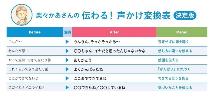 大幅に追加し本にまとめたのが『楽々かあさんの 伝わる! 声かけ変換』です。