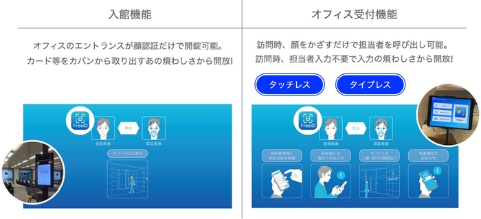 今回DXYZが取り組む実証実験では、DXYZが、自社及びプロパティエージェント株式会社の社員を対象に社内での顔認証機器および専用アプリ「FreeiD (フリード)」を提供し、システムの実用性やユーザーの利便性を検証します。FreeiDでは、オフィスでの入館日時状況や来客者への訪問日時連絡・来客者の方は顔認証だけ(タッチレス)で担当者呼び出しが可能となります。また担当者名入力不要(タイプレス)で入力手間の煩わしさもなくなります。