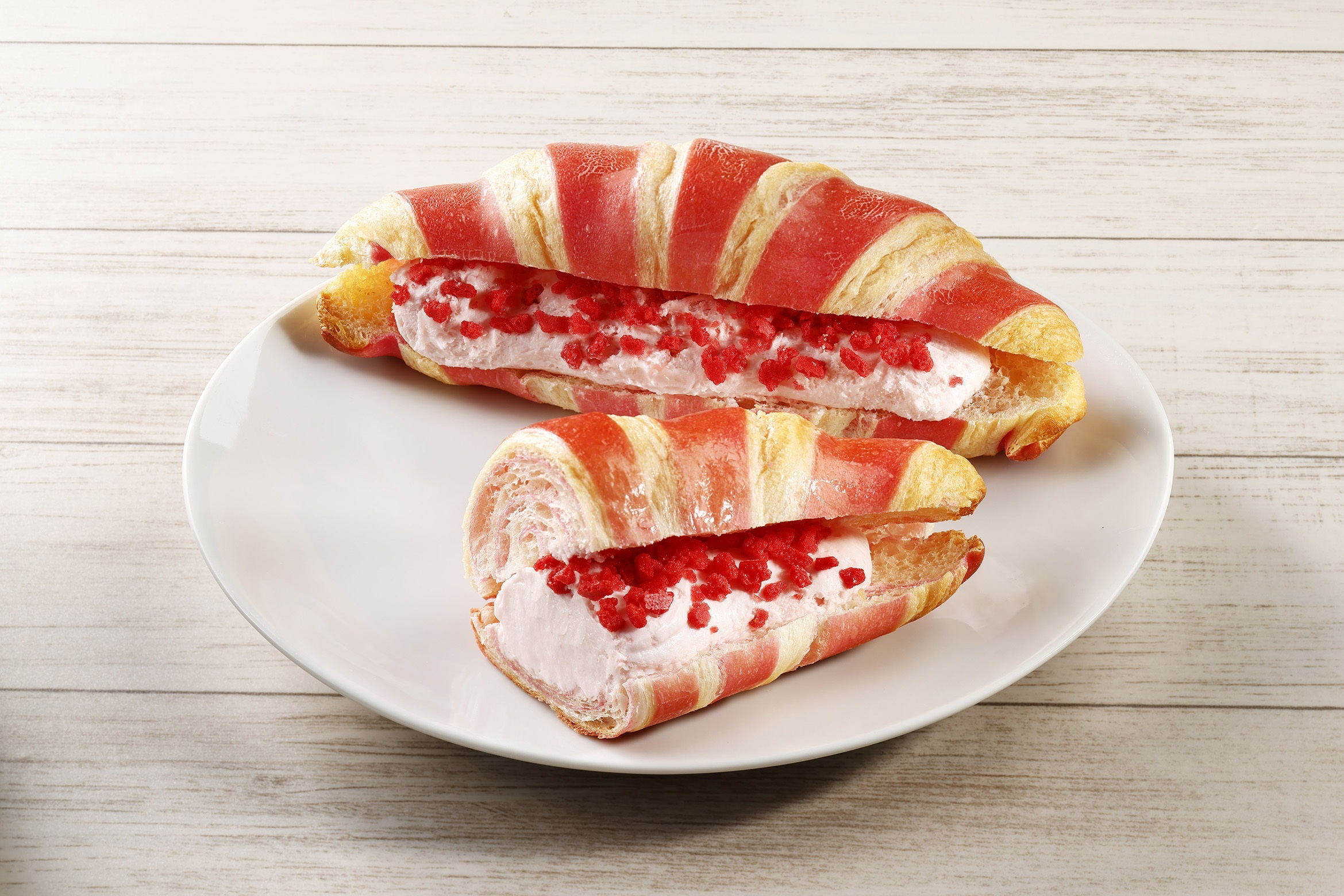 白とピンク、華やかな2色に焼き上げたクロワッサンに、宮城県気仙沼産のいちごジャムとホイップクリームを合わせたフィリングをサンドし、砕いたフリーズドライ苺をトッピングしました。生地には、宮城県産小麦の小麦粉を配合しています。