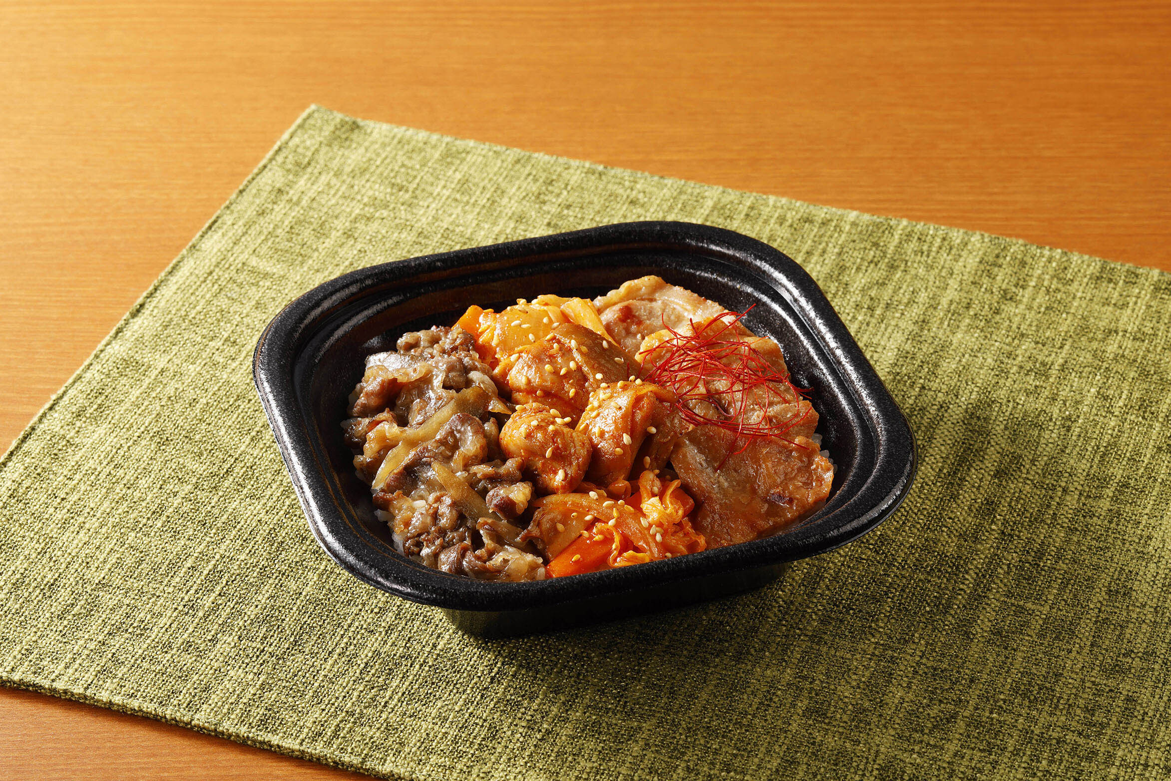 仙台牛のバラ肉と宮城県産森林どり、宮城県産豚もも肉を使用した三種のお肉が楽しめる特別な丼です。仙台牛はすき焼き風、森林どりはタッカルビをイメージしてピリ辛に仕上げ、豚もも肉はガーリックバター風味に仕上げました。それぞれ違った味わいで、最後まで食べ飽きない贅沢な美味しさです。