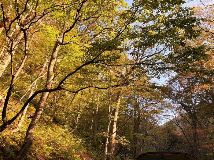 当ツアーは、人の動きが少ない早朝にスタートするため、朝日が渓流内に届き、紅葉が最も輝く瞬間を楽しめます。高さ約30メートル以上の樹木や岩壁のすぐ横を走り抜けると、見えてくるのは鮮やかに彩られた大自然のトンネルです。自然の美しさは一期一会で、朝陽を浴びた紅葉の色は彩りとコントラスが増し、より一層渓流の美しさを引き立てます。