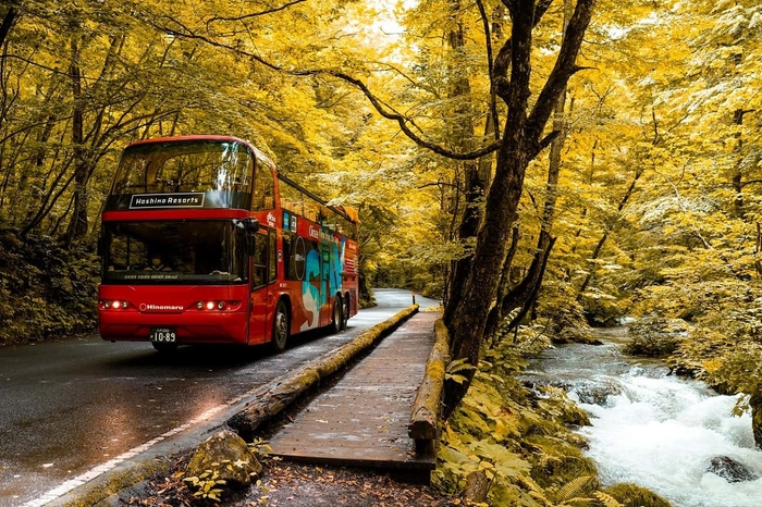 奥入瀬(おいらせ)渓流沿いに建つ唯一のリゾートホテル「星野リゾート 奥入瀬渓流ホテル」は、紅葉が見頃を迎える2021年10月16日~31日の土日限定で、今年も「紅葉プレミアムオープンバスツアー」を実施します。世界屈指の紅葉の名所として知られる奥入瀬渓流は、例年10月中旬から11月初旬にかけて、葉が黄色く色づく「黄葉(おうよう)」がピークを迎え、約70万人(*1)が訪れます。そんな賑わいを増す時期ですが、早朝に行う当ツアーは、昼間とはまったく違った静けさや澄んだ空気を感じながら、歩いてみるのとは違う目線で紅葉を楽しめます。さらに今年は、紅葉コンシェルジュがこのエリアの紅葉の特徴や見どころなどの話をし、紅葉狩りをより楽しめるようになります。黄金の森へと変わりゆく非日常の世界を走り抜ける爽快感や、360度の絶景を存分に味わえます。