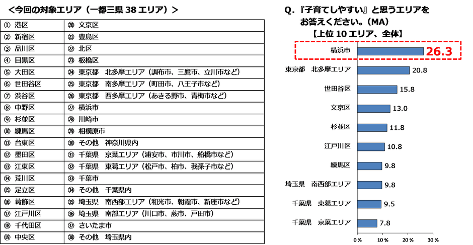 その結果、【横浜市】が「子育てしやすい」という項目において、38エリアで1位となりました(26.3%)。