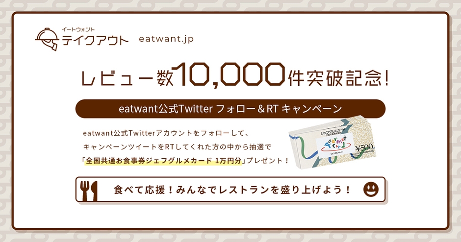 「eat want・テイクアウト」では、レビュー投稿数1万件突破、全国エリアへの対応を記念して、「eat want・テイクアウト」公式Twitterをフォロー&キャンペーンツイートをRTしていただいた方の中から抽選で50名様に1万円分の「全国共通お食事券ジェフグルメカード」をプレゼントするキャンペーンを開催します。キャンペーンを通じて、1人でも多くの方が「美味しい!」に巡り合っていただき、1店舗でも多くの店舗に活気が戻ることを期待しています。
