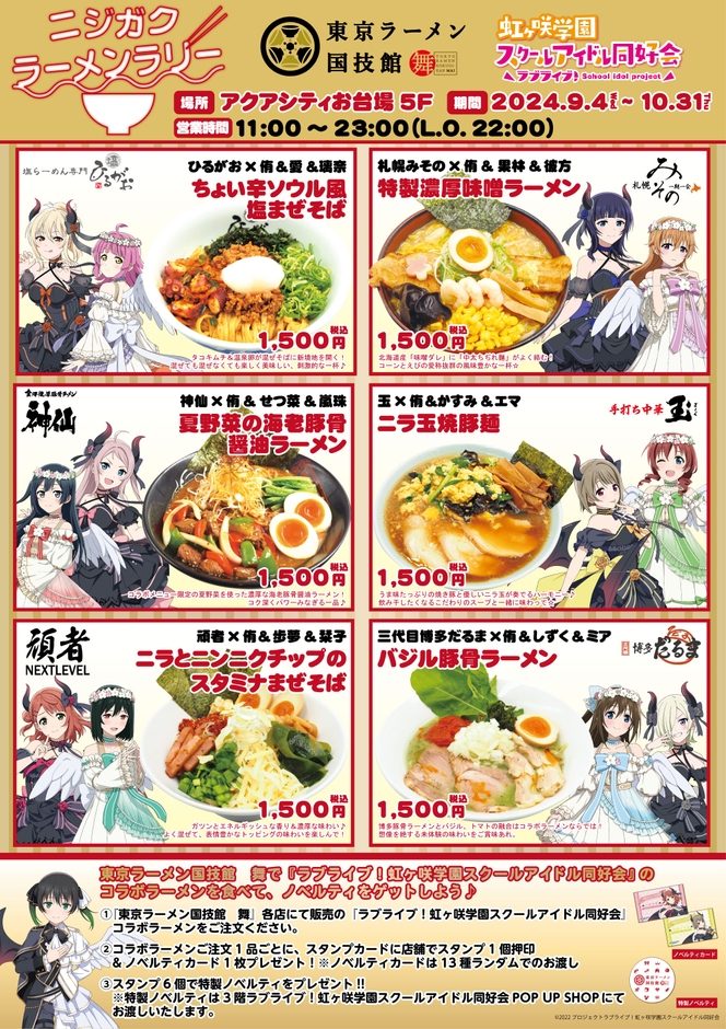 昨年に引き続き、アクアシティお台場 5F 「東京ラーメン国技館 舞」では、「ニジガク ラーメンラリー」を実施。日本を代表する人気行列ラーメン店全6店舗で、ニジガクメンバーをイメージした食材を使用した限定コラボラーメンをご用意しております。限定コラボラーメンをご注文いただくごとに、各店舗の特別スタンプとノベルティカードを1枚プレゼントいたします。さらに、期間中に合計6杯のコラボラーメンをお召し上がりいただいた方には、コンプリート特典として「オリジナル豆皿」をプレゼント。全国各地の絶品ラーメンをお召し上がりいただきながら、作品の世界観をお楽しみください。