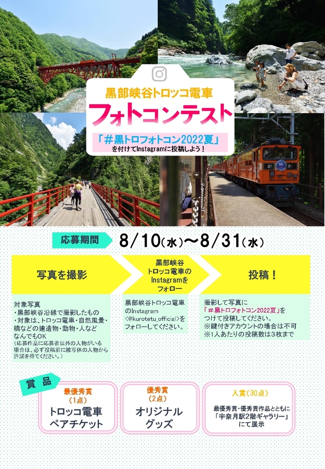 このイベントは、黒部峡谷で撮った写真に「 #黒トロフォトコン2022夏 」をつけてInstagramに投稿していただくものです。最優秀賞には「トロッコ電車ペアチケット」、優秀賞には「トロッコ電車オリジナルグッズ」をプレゼントいたします。