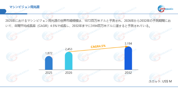 マシンビジョン用光源の世界市場は、2025年に1872百万米ドルと推定され、2026年には2453百万米ドルに達すると予測されています。その後、2026年から2032年にかけて年平均成長率(CAGR)4.5%で推移し、2032年には3194百万米ドルに拡大すると見込まれています。この成長は、半導体・電子機器製造、自動車、食品・飲料、物流といった産業における自動化・品質管理ニーズの高度化を背景としています。特に、製造現場での欠陥検出精度向上や生産ラインの柔軟性追求が、マシンビジョン用光源の高輝度化・波長多様化を加速させています(直近6カ月の業界動向として、中国市場ではLiDAR検査向け特殊光源の需要が前年比+12%増)。