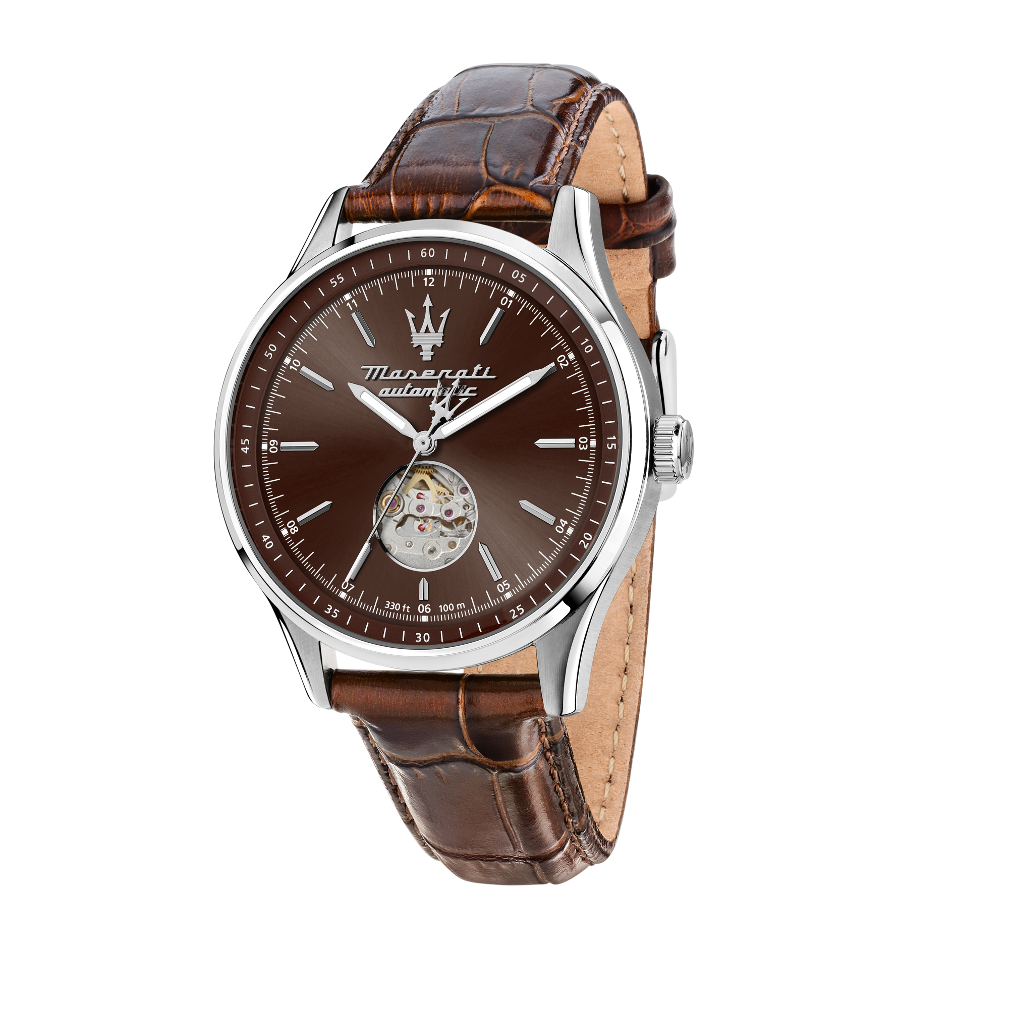 ブラウンレザーに包まれたソルパッソコレクションは、温かみと落ち着きを併せ持つタイムピースです。オールブラウンの自動巻きモデルはオープンハート仕様でムーブメントの駆動を楽しめ、クォーツモデルはクリームダイヤルに精緻なインデックスを配し、洗練された印象を与えます。ステンレススチールケースとブラウンレザーのバンド、10気圧防水と信頼性の高いムーブメントで日常使いにも安心。ブラウンの暖かみと精緻なディテールが融合した、マセラティらしい洗練と存在感を体現するタイムピースです。