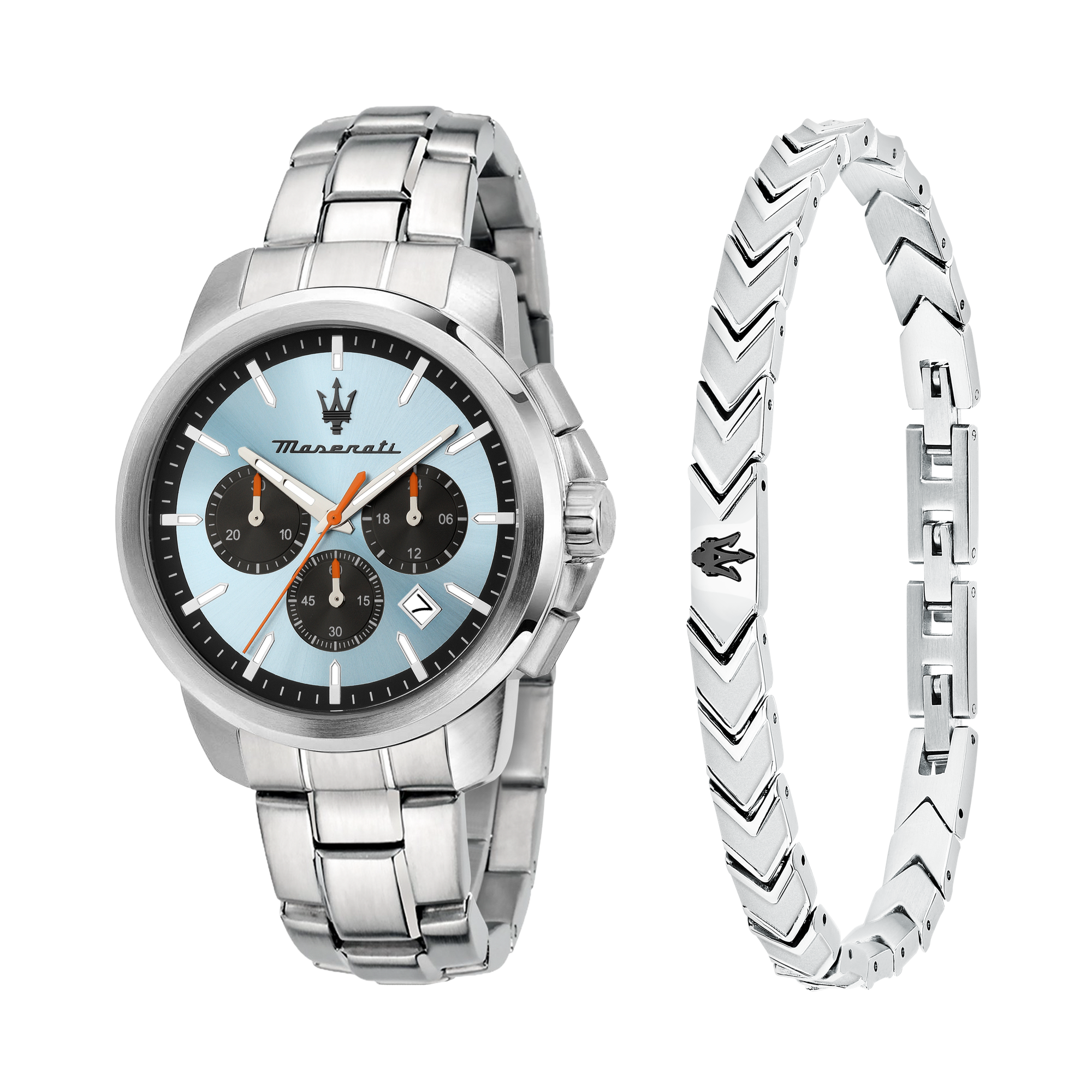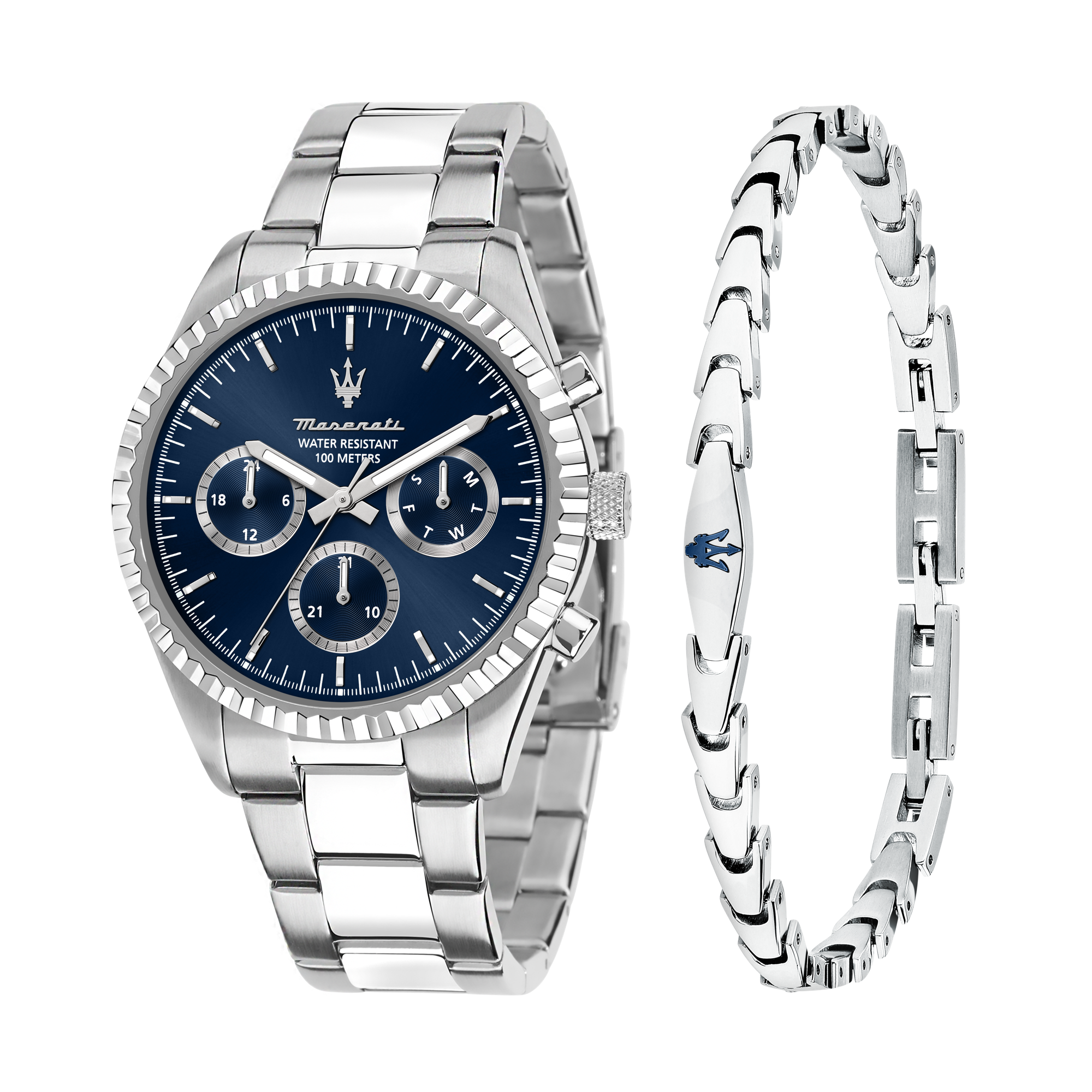 時計とブレスレットを組み合わせたスペシャルパックが登場。 43mmマルチファンクションの「Competizione」はブルーダイヤルとシルバーブレスレットにブルーアクセントのブレスレットを、42mmクロノグラフの「Successo」はブルーダイヤルとシルバーブレスレットにブラックアクセントのブレスレットをセット。どちらもステンレススチールケースとミネラルクリスタル風防を採用し、防水・日付機能を備えた上質なタイムピースで、ギフトにも最適な特別感を演出します。