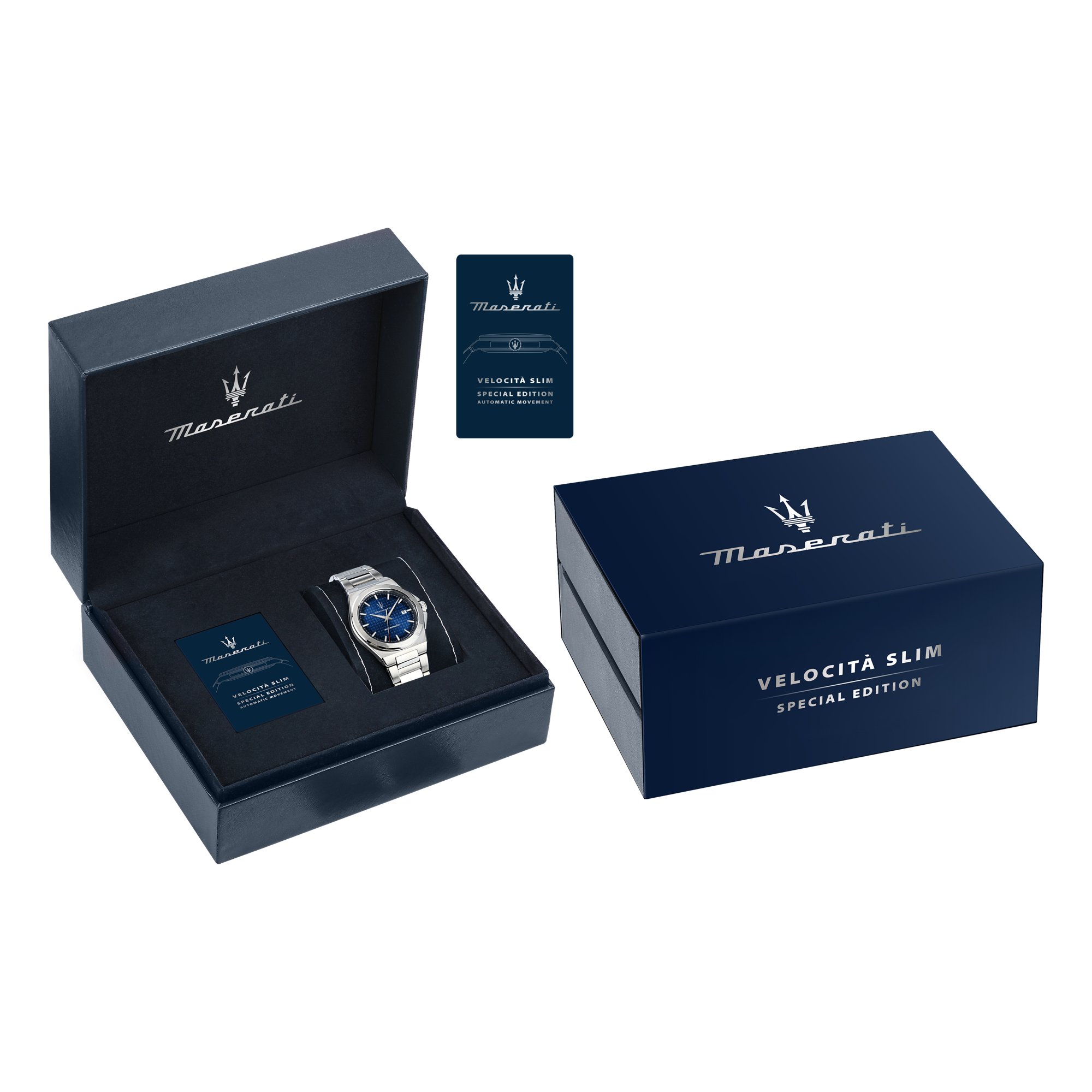 デザインの核は「軽やかさ」。自動巻モデルは厚さ10.7mm、クロノグラフは9.9mm、3針モデルはわずか7.8mmとスリムなフォルムを実現。軽量化により快適な装着感と携帯性を備えつつ、美しさと機能性も妥協していません。ステンレススチールケースは立体的なダイヤルを包み、中央でマセラティの象徴「トライデント(Trident)」が輝きます。スクリュー式リューズやケースバック、精緻なベゼルなど細部に至るまで上質を追求。「Velocità Slim」は、大胆さとモダンデザインを融合させ、イタリアの美学と情熱を刻むタイムピースです。