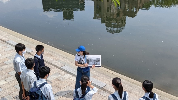 当日は、中学3年生の4クラスを2グループに分け、PCVのガイドとともに、広島平和記念公園内でのフィールドワークや広島平和記念資料館の見学などを行います。フィールドワークでは、かつて広島有数の繁華街だった旧中島地区の暮らしに焦点を当て、広島の歴史や人々の生活について学びます。また、学んだことを単に知識として留めるのではなく、戦争や平和について自分事として主体的に考えることを目的に、後日、総合学習の授業内でグループワークを行います。グループワークでは、フィールドワークや資料館の見学から学んだ内容や意見を互いに共有し合い、平和な社会を維持するために自分たちにできることは何かなどをテーマに議論します。