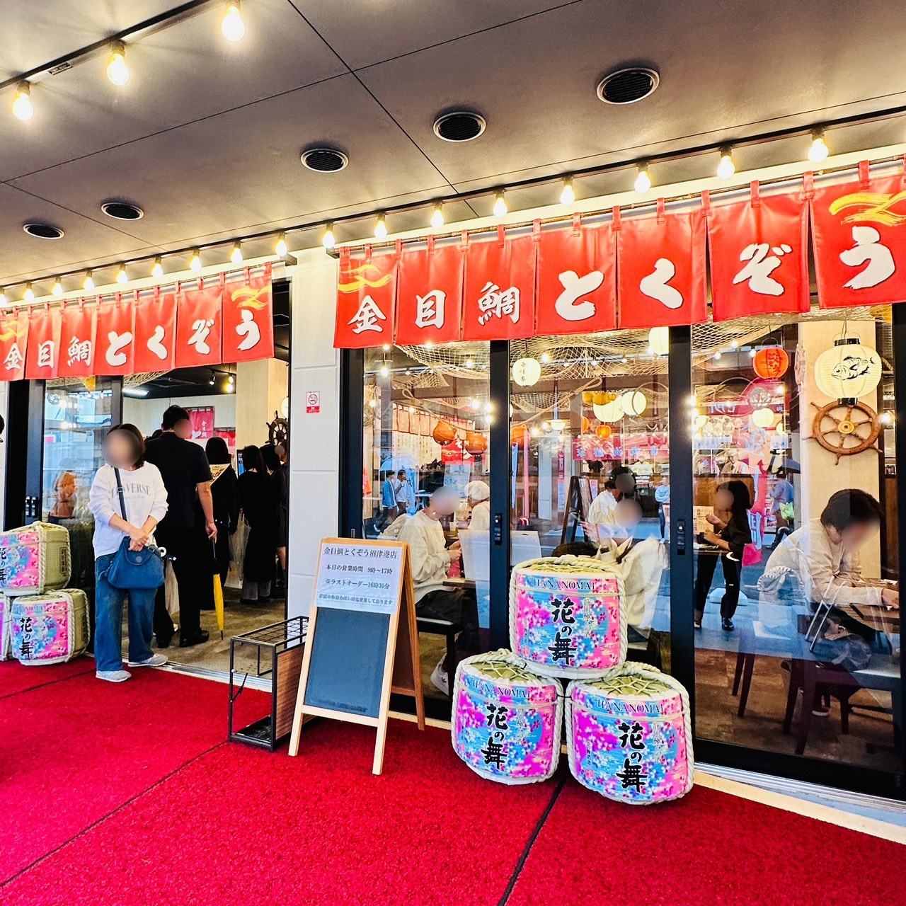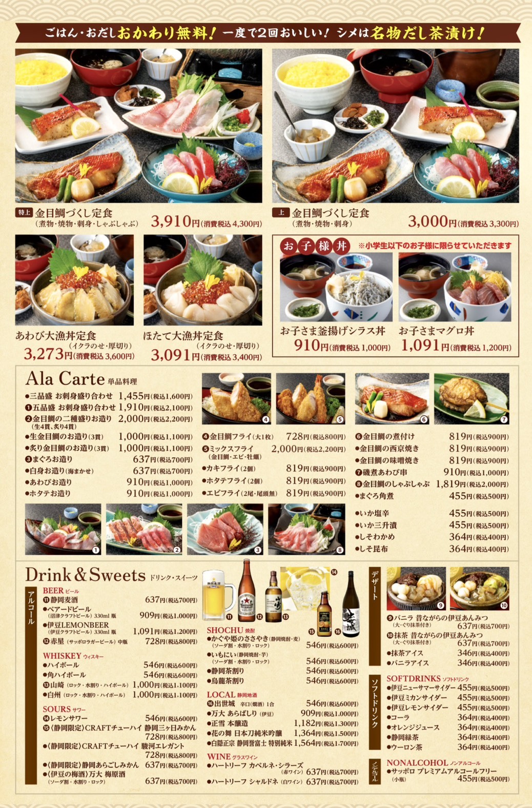 静岡県が水揚げ日本一を誇る名産の金目鯛を使用。創業地・伊豆稲取伝統の「金目鯛の煮つけ」や、豪快な漁師料理「てんこ盛り魚屋まかない丼」などの金目鯛料理・網元料理を中心に、丼・御膳などを提供する金目鯛専門店。