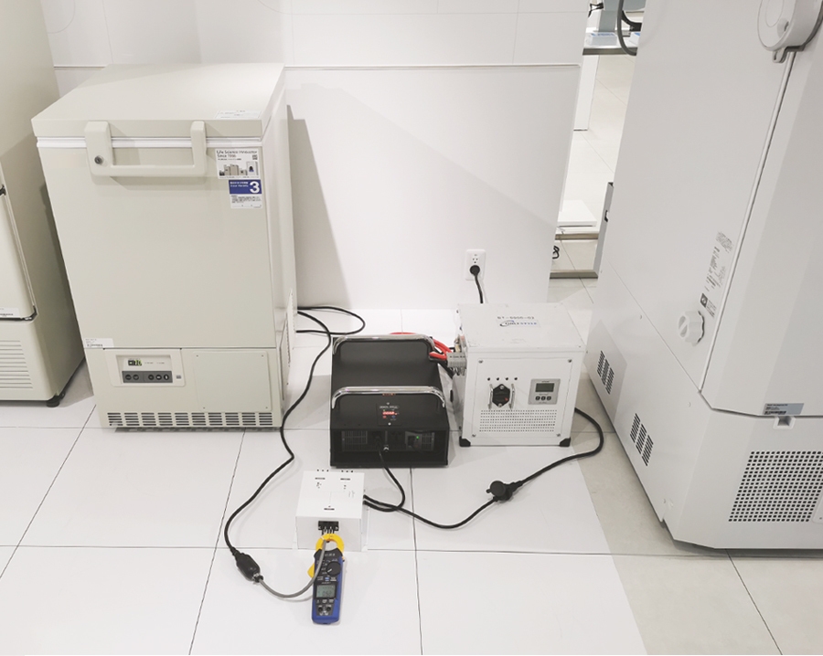ワクチン保管用の超低温フリーザーは、冷却をはじめる時(コンプレッサーを動かす時)に定格消費電力の5倍~10倍程度の大きな電力を必要とする突入電力が大きいことも特徴で、突入電流に対応できる電源装置を選定する必要があります。