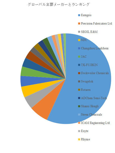 主要生産企業としては、Entegris、Precision Fabricators Ltd、SEOIL E&M、SDC、Changzhou Leadchem、JAC、TK-FUJIKIN、Dockweiler Chemicals、Swagelok、Rotarexといったグローバルプレーヤーが挙げられる。2024年時点で世界のトップ5企業は売上の観点から約48.0%の市場シェアを占めており、高度な技術力とブランド力を背景に市場をリードしている。特にEntegrisやSwagelokのような企業は、半導体材料供給チェーン全体をカバーするソリューションを展開しており、顧客からの信頼を確立している。一方、新興企業や地域特化型メーカーも台頭しており、価格競争力やカスタマイズ性を武器に市場シェア拡大を狙っている。今後は大手企業による統合や提携が加速し、業界再編の動きが一層顕著になることが予想される。
