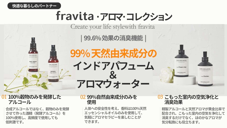 fravitaブランドは、香り(fragrance)とビタミン(vitamin)を組み合わせた製品を提供することを使命としています。日常生活のささいな行動を肌の美しさと身体の健康づくりにつなげることができるよう、プロのアロマ調香師が厳選した香りと世界的なビタミン製造企業DSM社のビタミンを使用しています。