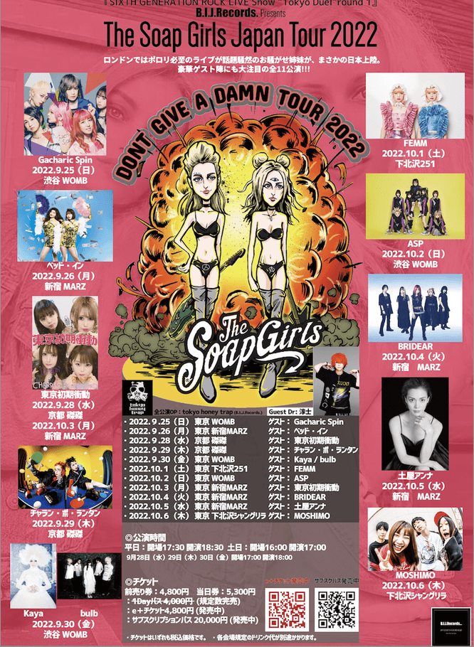 新人バンドや伝説のアーティスト達を独自の選択眼で世界中から集めリアルとライブをコンセプトに、現在世界中のバンドと契約を行っているB.I.J.Records.(ビーアイジェイレコーズ)の新型コロナ後第一弾となる、アイドル出身の姉妹パンクバンド【The Soap Girls/ザ・ソープガールズ】の初来日ツアーを2022年9月25日から東京・京都のライブハウスで順次開催いたします。既報に加えて、10月6日のツアーファイナル(最終日)はZ世代で大人気の【MOSHIMO】の出演が決定し全てのゲストが確定しました。
