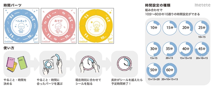 やることの時間を決めて表示できる「時間パーツ」付き。時間パーツは「べんきょう」「あそび」「フリー」の3種類。「フリー」パーツには、自由に書き込んで使えます。それぞれのパーツは「20ぷん」1枚、「15ふん」2枚、「10ぷん」1枚付きで、60分以内の10通りの時間設定ができます。時間を見える化することで、時間を意識しながら集中してやりきることができます。例えば、「宿題を30分間する」場合、「べんきょう20ぷん」と「べんきょう10ぷん」のパーツを、時計の「今の時刻」に合わせて貼ります。勉強を開始し、長針がパーツを越えたら予定時間終了!「ゲームを30分間しよう」と計画すると、延長しがちなゲームをダラダラやり続けることがなくなります。時間パーツは貼って剥がし、繰り返し使えます。