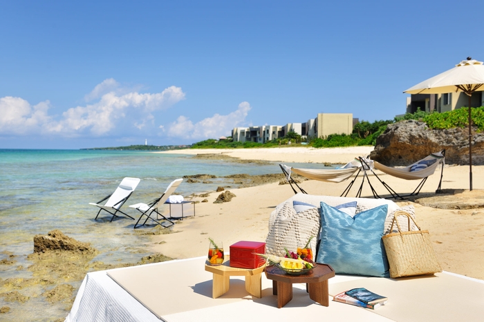 各施設が独創的なテーマで、圧倒的非日常を提供する「星のや」。沖縄県・読谷村にある滞在型リゾート「星のや沖縄」では、2022年3月1日〜5月31日の間、絶景に身をゆだねて心と身体をリフレッシュする「はまうりアフタヌーンティー」を提供します。星のや沖縄の前に広がる自然海岸に、爽やかな潮風を感じられる3つの特別席を設えます。沖縄らしさを感じるオリジナルスイーツや伝統ハーブとフルーツが爽やかに香るフルーツブレンドティーを特別席で楽しめる、1日1組限定の贅沢なアフタヌーンティーです。