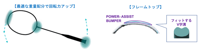 グリップエンド、フレームトップ、ジョイント部に重量を配分し強力な連続攻撃を実現。さらにフレームトップに「パワーアシストバンパー」を用いて重量を追加するとともに、フレームにシームレスにフィットする新形状により空気抵抗を低減。シャトルへのパワー伝達を強化しつつ、スムーズな連続ショットを可能とします。