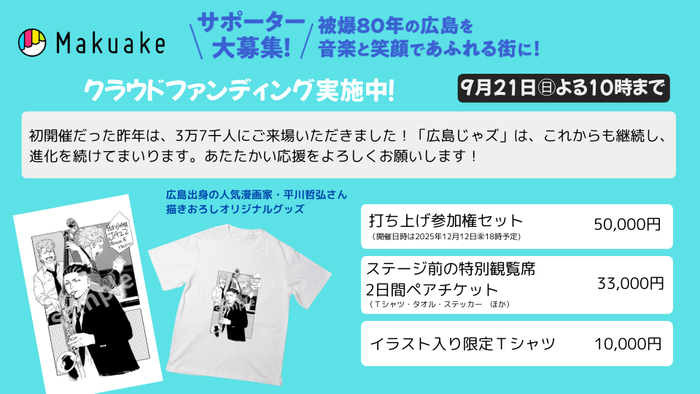 詳しくはこちら(https://www.makuake.com/project/hiroshimajazz2025/)をご覧ください。