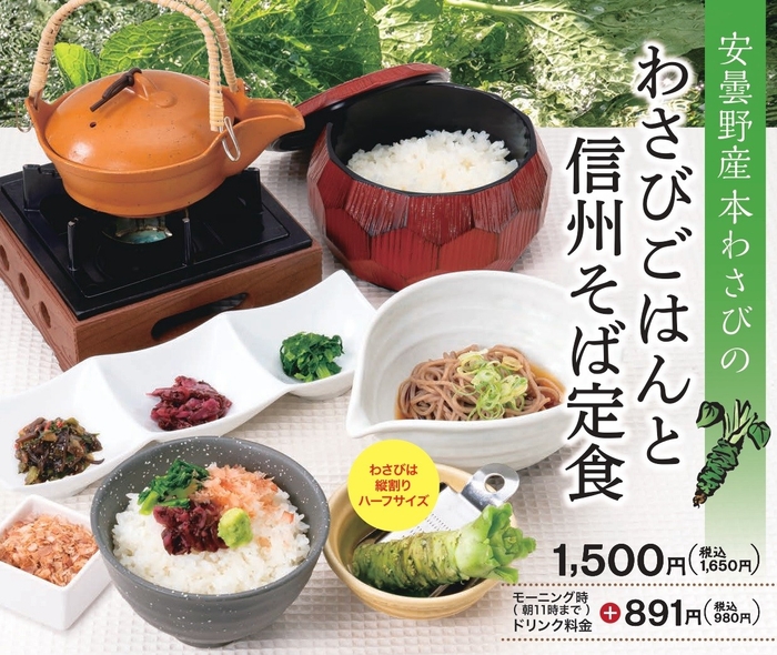 兵庫・大阪・奈良で13店舗を展開する「上高地あずさ珈琲」の姫路伊川谷店・奈良橿原店店限定・阪急三番街店で!2月17日(月)より「わさびごはんと信州そば定食」を期間限定で販売します。