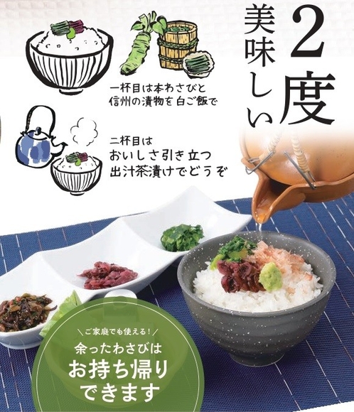 安曇野産の本わさびを使って信州のお米やそばを食べれるプレミアム定食です!