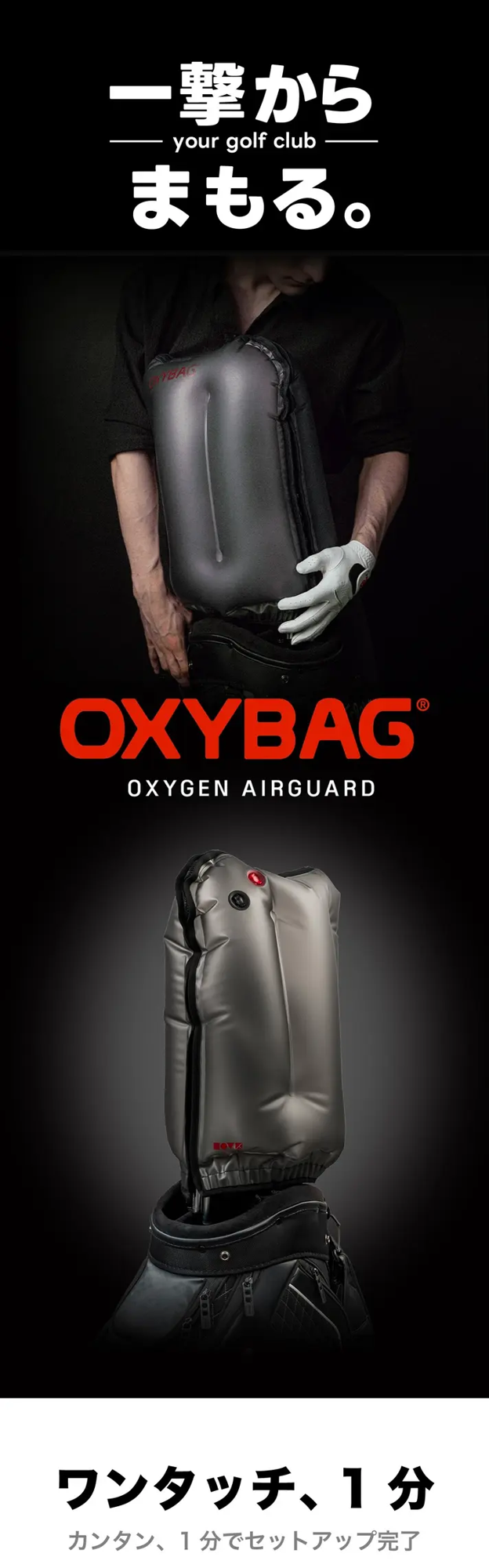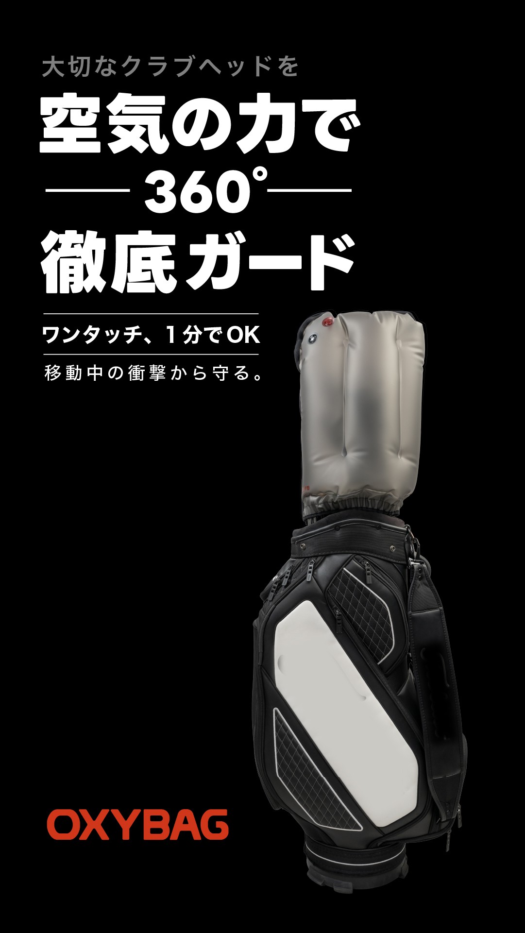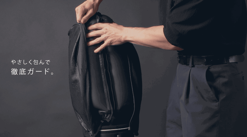 「ワンタッチ約1分!クラブが無防備になる時間に、備える。空気で包むクラブガード」