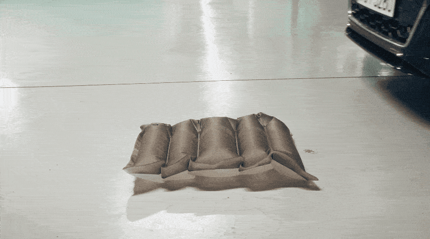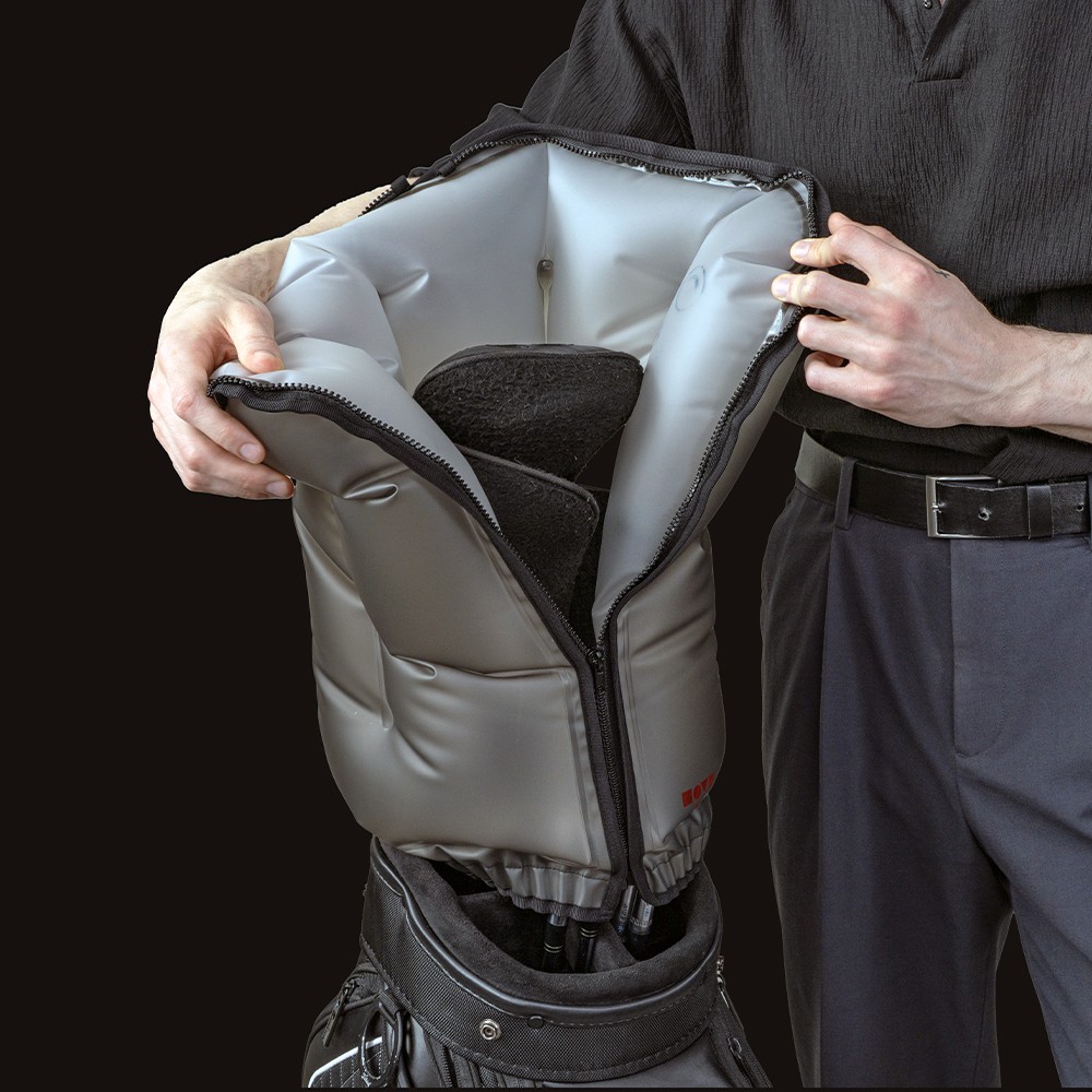 従来のハードケース(外側保護)とは逆の発想で、ゴルフバッグ内部に挿入し、専用ポンプで膨らませることでクラブ全体を包み込みます。5層独立エアチャンバー(5-Layer Air Cushion)が、移動中に想定されるさまざまな衝撃を受け止めます。
