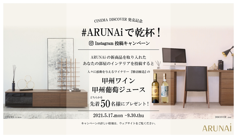 リモートワークやホームエンターテイメントが当たり前になったりと、おうち時間が長くなる中、山梨で140年以上の歴史を持つ家具メーカー、内藤家具インテリア工業が提供する「ARUNAi」が、おうち生活を充実させる提案として、自然の土地に恵まれた山梨で共に営んでいる勝沼醸造のワインで、山梨の自然の恵みに「#ARUNAiで乾杯!」キャンペーンを開催します。