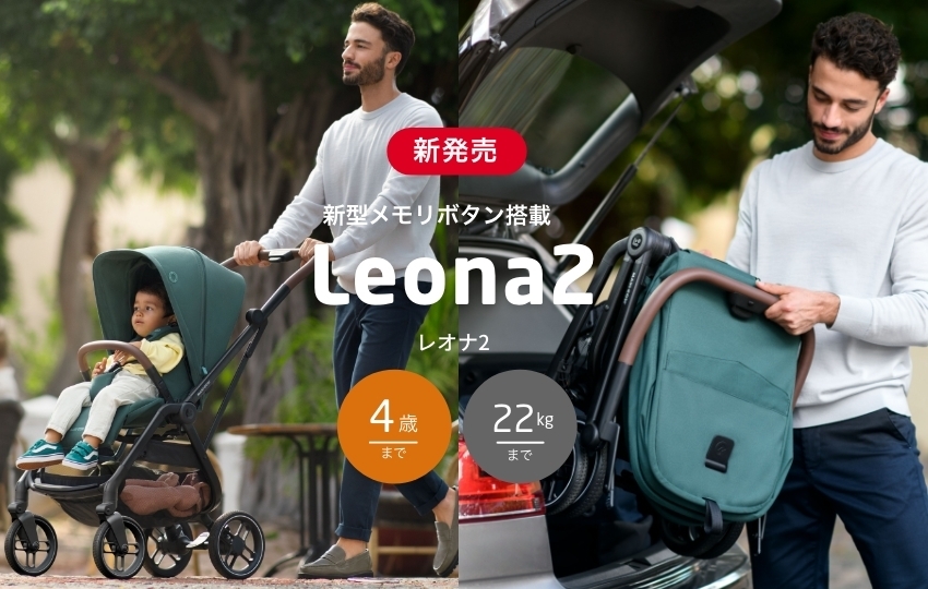 人気チャイルドシートブランドが手掛けた日本初上陸のコンパクトベビーカーとして昨年発売し、売り上げ好調なレオナ。その後継モデル「レオナ2」は、世界最高レベルの安全性(※1)とコンパクト性能はそのままに、シート切り替えがワンタッチでできる新型メモリボタンや、段差をスムーズに乗り越える大型タイヤなど、使いやすさをさらに進化させました。