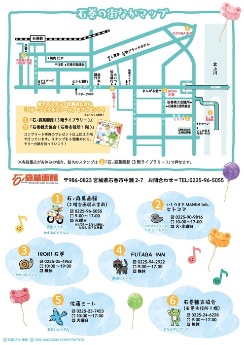 6ケ所のスタンプポイントを巡り、全カ所でハンコを押した方にはオリジナルデザインの特典ステッカーをプレゼントします。(各設置店がお休みの場合、該当のスタンプは「石ノ森萬画館(3階ライブラリー)」で押せます。)