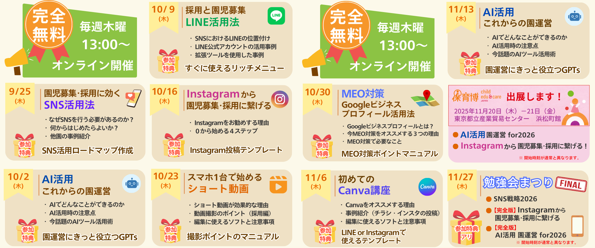 少子化・採用難・業務負担といった現場の課題に向き合い、SNSやAIを使った実践的な解決策をテーマに、毎週木曜、約1時間のセッションを全10回にわたって届けます。