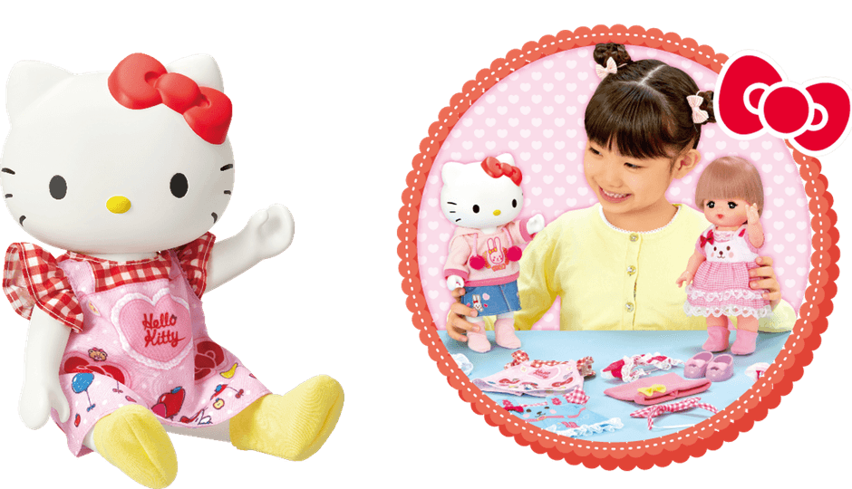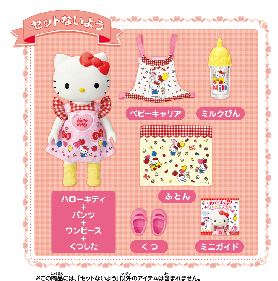 メルちゃんのおともだちとして、「ハローキティ」が登場。メルちゃんのきせかえふくや、パーツを使うことができます。ミルクびんでミルクをのませてあげたり、ベビーキャリアに入れておんぶやだっこをしたり、おふとんをかけておねんねさせてあげたり、いっしょにおふろに入ったりと、メルちゃんとキティちゃんと一緒に、いろいろな遊びかたで楽しめます。