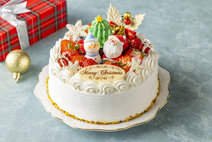 クリスマスケーキの定番、苺のショートケーキ。今年は真っ白なケーキの上にメレンゲで作ったクリスマスツリーと愛らしいサンタ、スノーマンを飾り付け、さらに周りをたくさんの苺で彩りました。華やかなクリスマスを盛り上げてくれる可愛らしいデザインです。くちどけなめらかなスポンジと軽やかな生クリームでフレッシュな苺をサンド。苺の甘酸っぱさとクリームの優しい甘さが口の中でとろけ合う幸せななひとときをお届けします。