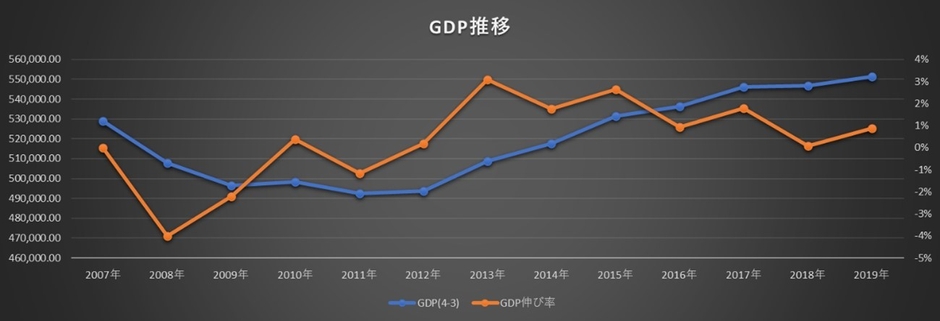 実際に上記グラフ示す通り、安倍内閣発足の2012年以降国内GDPは成長傾向にありました。