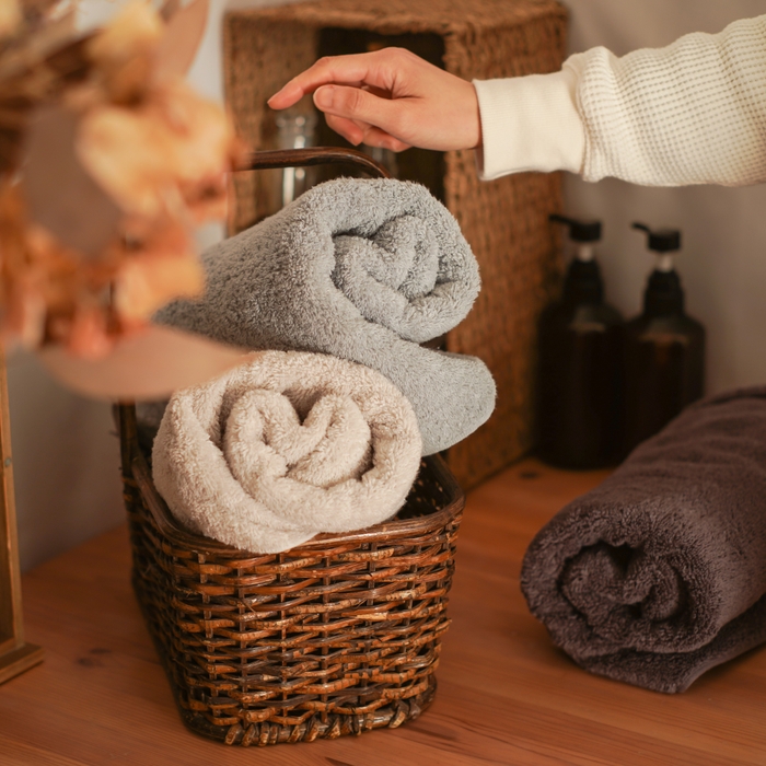 軽量感、抜群の吸水力、速乾性、毛羽落ちの少なさ、ふっくら感の持続キレのある拭き心地といった特徴があります。たっぷり空気を含んでいるので、同じ重さのタオルと比較しても2倍のふっくらボリュームがあります。