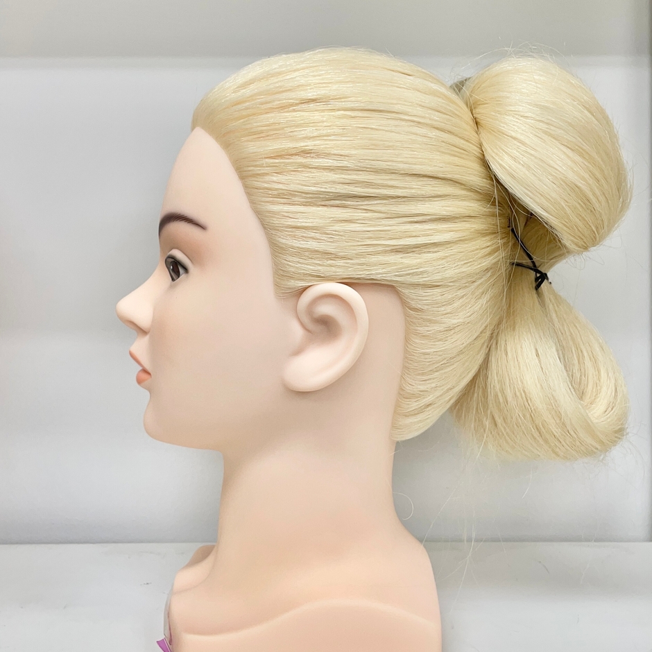 第2回のテーマは日本髪の代表格、「島田髷(しまだまげ)」です。女性の髪型は、時代によって違い、また身分や年齢、未婚・既婚の別によっても違います。島田髷は、東海道島田宿の遊女が発祥で、それが大流行し、未婚女性の髪型の定番とし定着したと言われています。島田髷と言っても、江戸時代初期、中期、晩期、そして近年以降では形も雰囲気も全く異なり、とてもバリエーションの多い髪型と言えます。そんな島田髷ですが、古墳時代の埴輪に「古墳島田」と呼ばれるものがあります。島田髷に結い方が似ているところから島田と呼ばれていますが、島田髷が登場するのは江戸時代前期であり、時代が大きくかけ離れています。古墳島田の髷の作り方は近世の島田髷と同じで、髪を頭頂部で一度束ね前後に折り返し、紐で縛って固定しています。当研究所でも「古墳島田」を模してマネキンで再現してみました。