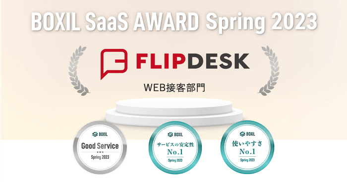 今回の「BOXIL SaaS AWARD Spring 2023」は、2022年1月1日から2022年12月31日までの1年間で新たに投稿された口コミ約14,000件を審査対象としており、「Flipdesk」は「WEB接客部門」で「Good Service」ほか、「サービスの安定性No.1」「使いやすさNo.1」の2つのNo.1に選ばれました。