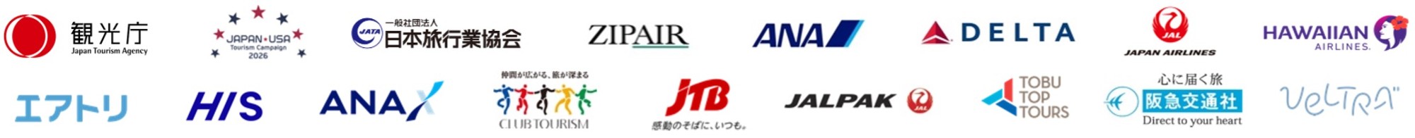 観光庁、一般社団法人日本旅行業協会、株式会社ZIPAIR Tokyo、全日本空輸株式会社、デルタ航空、日本航空株式会社、ハワイアン航空、株式会社エアトリ、株式会社エイチ・アイ・エス、ANA X株式会社、クラブツーリズム株式会社、株式会社JTB、株式会社ジャルパック、東武トップツアーズ株式会社、株式会社阪急交通社、ベルトラ株式会社