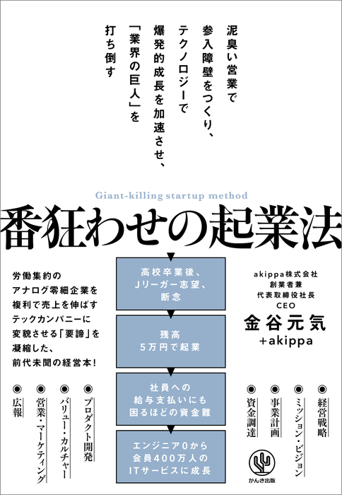 ゼロからイチの起業、そしてサービス立ち上げのノウハウはもちろん、事業が形になり始めてからのミッション・ビジョン作り、経営戦略、プロダクト、マーケティング、広報など、金谷氏とakippa社が突き進んだ事業成長の道のりをこの1冊に凝縮しました。