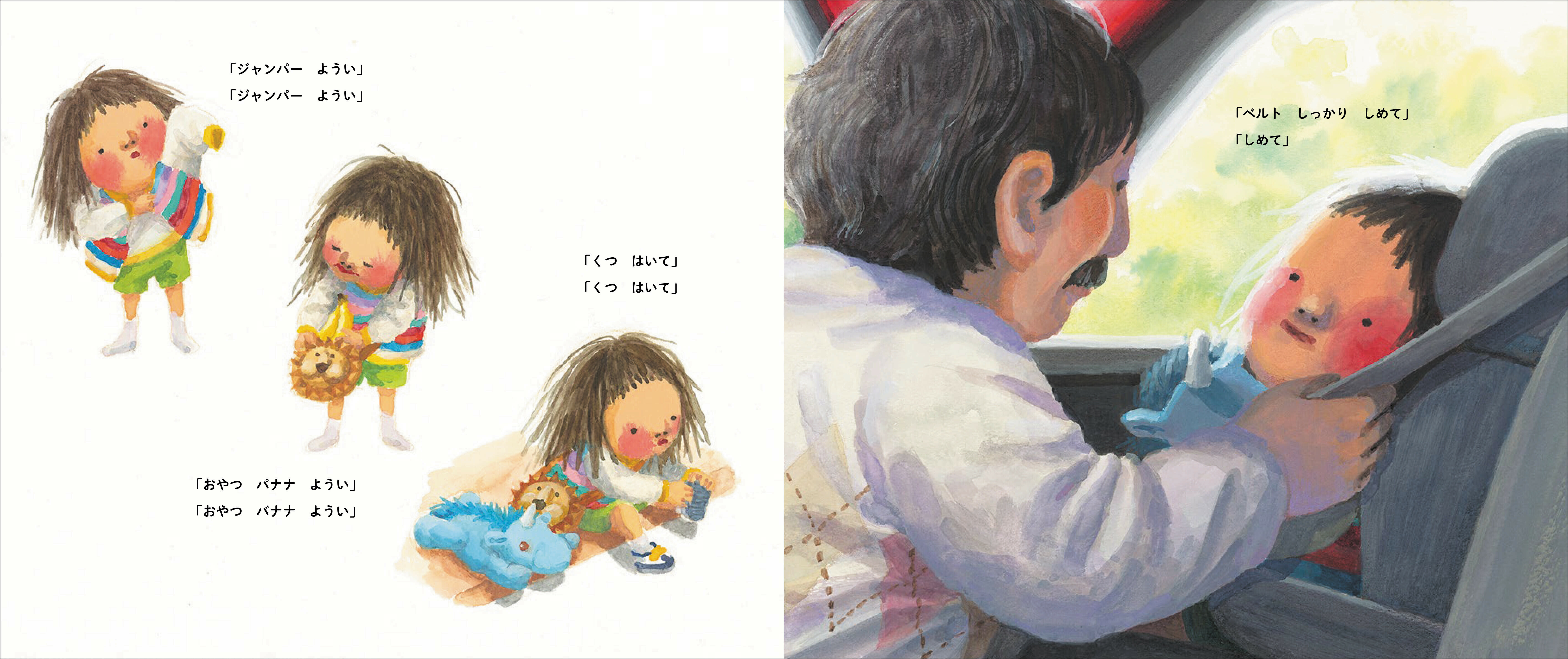 「ドライブってね、くるまで おでかけすること。さ、じゅんび じゅんび」