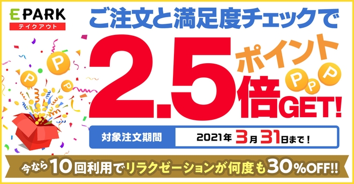 株式会社EPARKテイクアウト(本社:東京都豊島区、代表取締役:栁澤 真一)は2020年10月より、運営するテイクアウト予約サイトの利用者に通常付与されるEPARKポイントが、2.5倍になるキャンペーンをスタートしました。