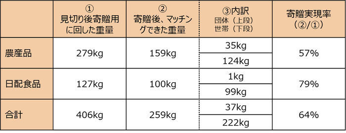 実証実験期間の約2か月間(55日間)で、農産品(野菜・果物)約159kg(856点)、日配食品約100kg(412点)の合計約259kg(1268点)の食品を寄贈しました。