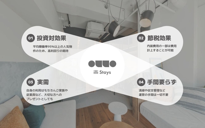 また、初期コストの減価償却による節税効果へのアプローチに期待でき、宿泊料収入からの利益分配、さらに「illi Stays」を所有することで、ご自身やご家族が実際に宿泊利用できるといった、単なる収支を超えた付加価値を体験していただけます。