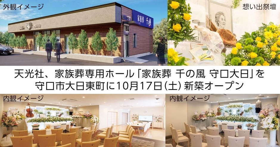 天光社ならびに家族葬 千の風ブランドで葬儀会館を全国展開する、株式会社天光社(本社:福岡県福岡市、代表取締役社長:江村 哲也、以下 当社)は、2020年10月17日(土)に家族葬専用ホール「家族葬 千の風 守口大日(もりぐちだいにち)ホール」を大阪府守口市にオープンいたしました。