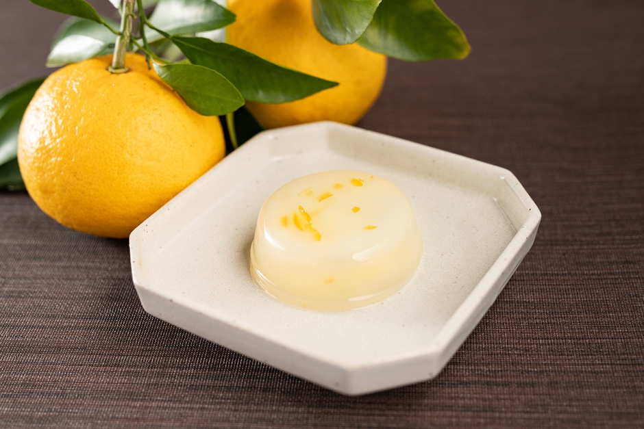「夏柑葛餅」は、葉山産の夏みかんの甘酸っぱい果汁と、果皮を使用した、果実味を楽しめる爽やかな一品。夏はよく冷やすとより一層美味しく味わうことができます。