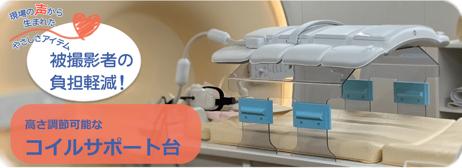 腹部MRIを撮影する際には約3kgのコイルを40分程度体に載せる必要があり、患者様の負担になっていました。腹部MRIコイルサポート台をご利用いただく事によりコイルを直接体に載せる必要が無くなり、患者様の負担が大幅に軽減されます。また本製品には本体に加え、高さ調節用足を付属しており、高さ調節が可能になりました。これにより本製品1つで様々な体形の患者様に対応する事が出来ます。