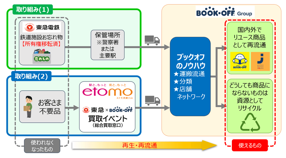 東急株式会社、東急電鉄株式会社(以下 「東急電鉄」)、ブックオフグループホールディングス株式会社と、その子会社であるブックオフコーポレーション株式会社(以下 「ブックオフ」)の4社は、「モノを捨てない」資源循環型まちづくりへの実証実験第1弾として、東急線の駅や車内などの鉄道施設で拾得されたお忘れ物のうち、法的に保管期間が過ぎ、東急電鉄が所有権を取得したものを、ブックオフを通じてリユース品として再流通させる取り組みを開始します。また、東急線沿線のお客さまがより気軽にリユースを行える取り組みとして、期間限定のブックオフ不要品買取イベントを、武蔵小山駅直結のエトモ武蔵小山で実施します。