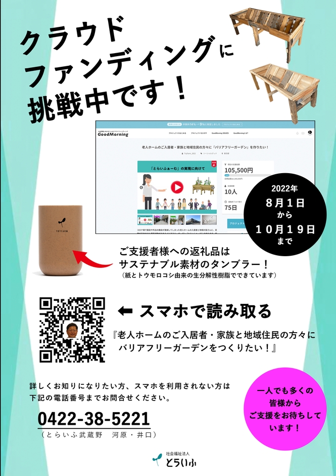 社会福祉法人とらいふ(所在地:東京都武蔵野市、理事長:黒竹 光弘)が展開する東京都武蔵野市にある特別養護老人ホーム「とらいふ武蔵野」では、コロナ禍で激減した利用者と家族の触れ合いや、施設と地域住民の交流をどうにかして復活させたい、そんな思いから利用者・家族・地域住民の交流を目的としたバリアフリーガーデンを作るため、社会問題と向き合う人のクラウドファンディングサイトGoodMorningでプロジェクトを2022年10月19日まで実施しております。