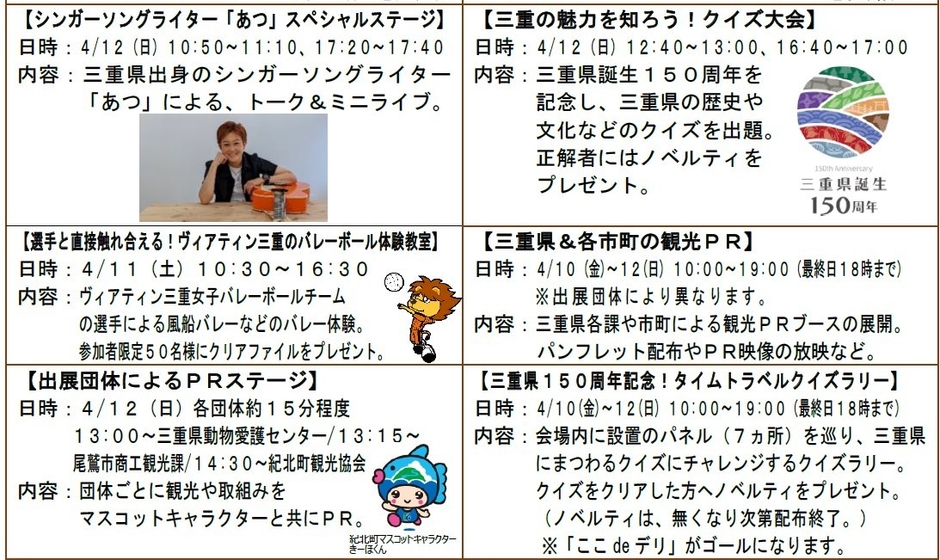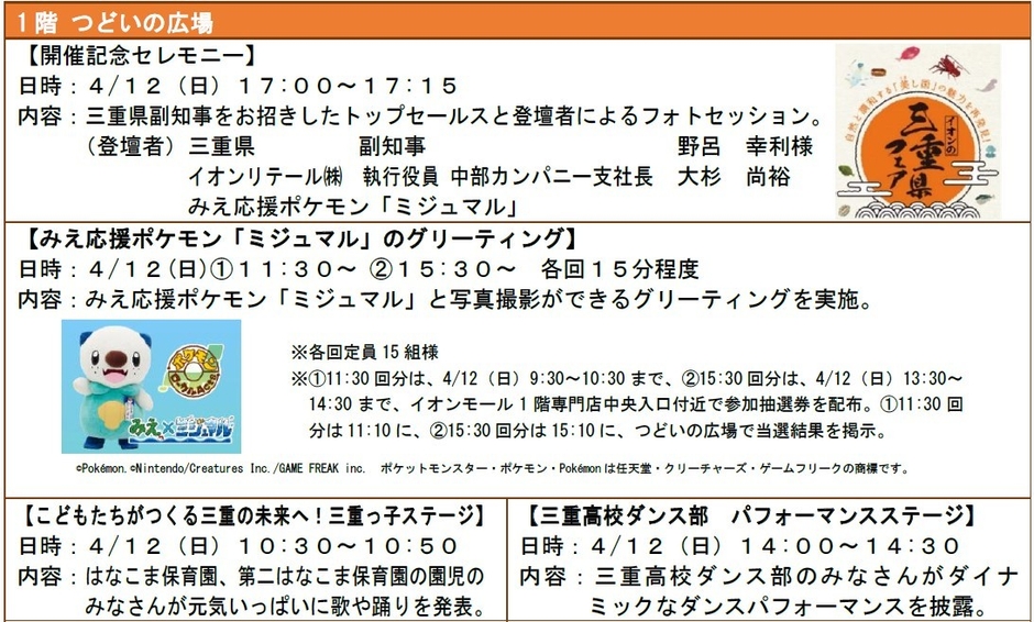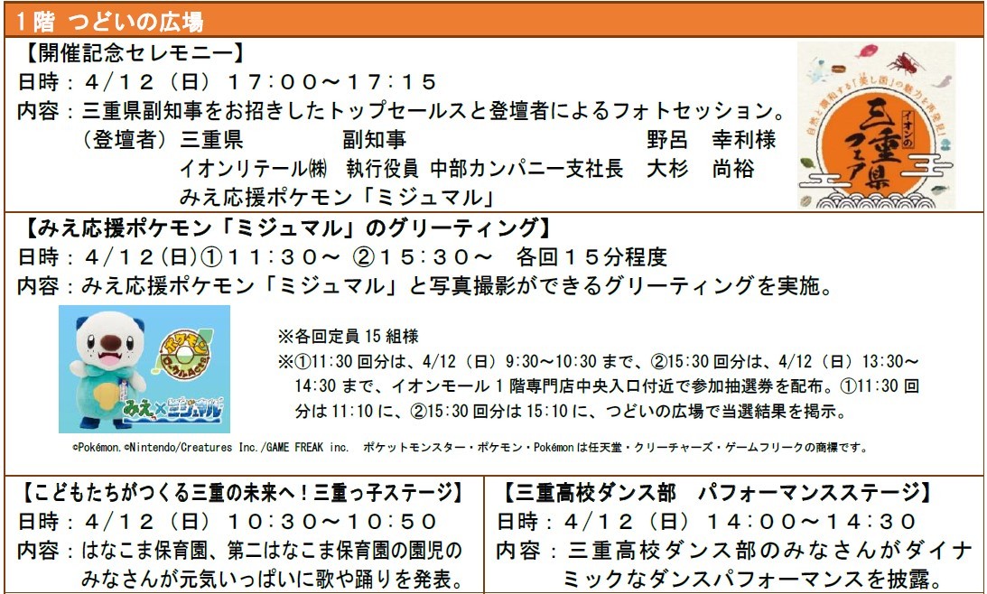 イオンリテール中部カンパニーは、三重県誕生150周年を迎える4月18日(土)に先駆けて、4月10日(金)から12日(日)の3日間、イオンモール津南(三重県津市)にて、三重県産品の販売や県の情報発信、体験イベントなどを行う「イオンの三重県フェア」(以下、当フェア)を開催します。またフェア期間中、中部エリアの「イオン」「イオンスタイル」94店舗の 食品売場※1でも、三重県産の農水畜産物・加工品などの販売を行うフェア※2を実施し、県産品の消費拡大に取り組みます。